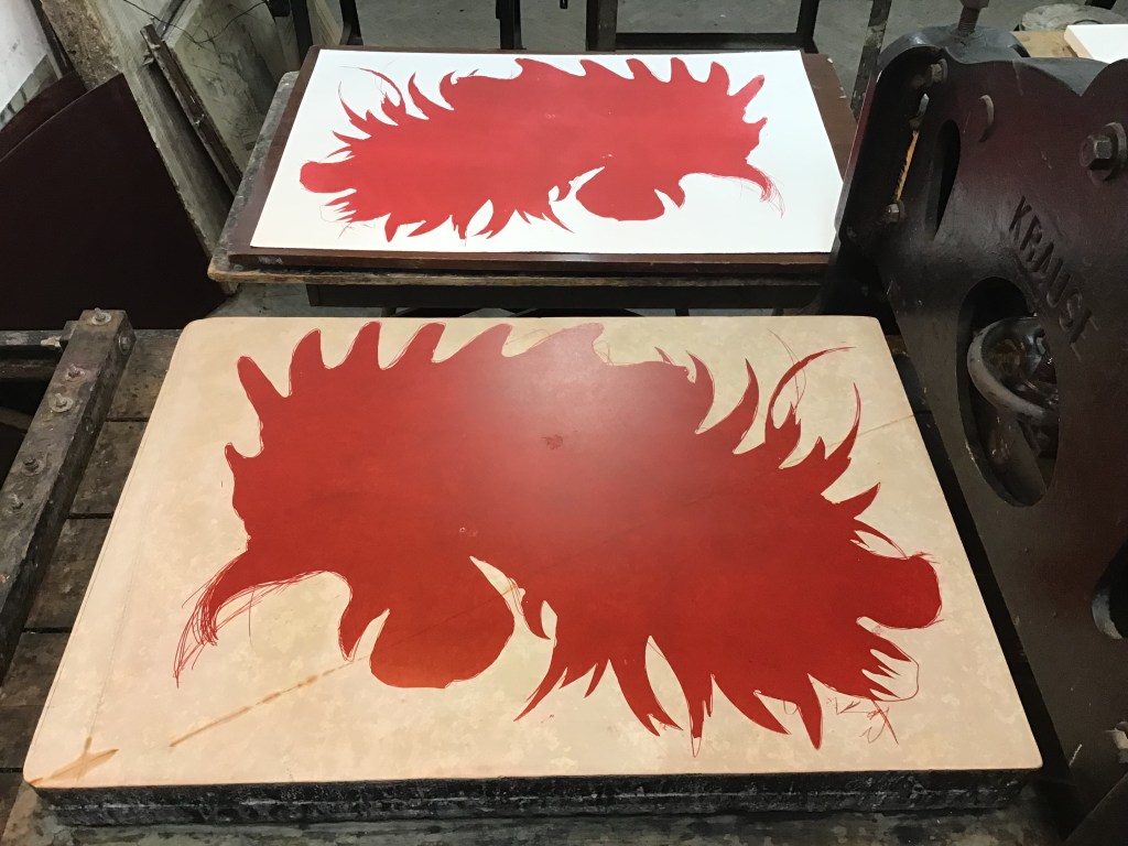 The prints are made on lithographic press. Printing ink from stone goes to paper under a pressure of about 300 kg. Such a large pressure also makes the uniqe twxture of the stone imprint on the papaer, which can be seen under high magnification.